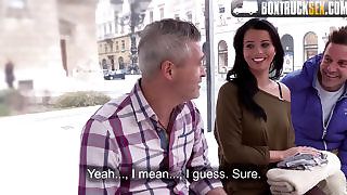 Пара трахкає приємну брюнетку з членом і страпоном одночасно